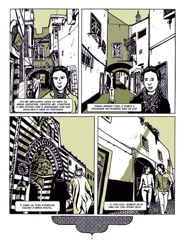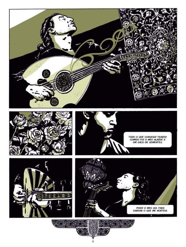 Em vinhetas pontuadas pelos arabescos, como o nome indica tão do gosto árabe, misturam-se os versos de Fernando Cabrita, as imagens de Mascarenhas, e os sons que se advinham de dois instrumentos de origens diversas, mas afinal tão próximos, numa feliz união que nos faz ler de seguida toda a obra, até ao lamento final que o poeta deixa, mas que o desenhador afasta com o voo das gaivotas.