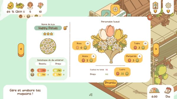 No final de cada dia, receberás um resumo da satisfação da cidade, incluindo o que os residentes gostaram ou não gostaram. Isto dá-te a oportunidade de fazer ajustes—seja aperfeiçoando as tuas receitas, mudando as tuas ofertas, ou melhorando o layout da tua rua. Gostei principalmente deste ponto, pois assim conseguia vigiar com mais atenção a minha rua.